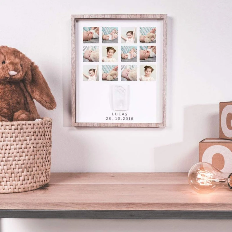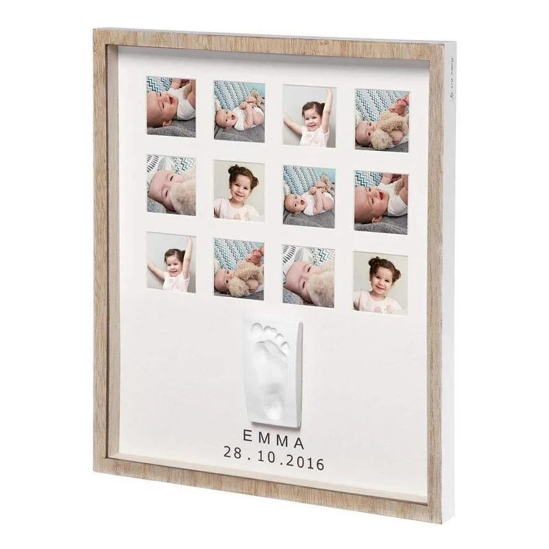 Baby Art Portafoto Primo Anno My Very First Year con Kit Impronta e 12 Fotografie di Baby Art è un quadro con 12 portafoto utile per raccogliere i progressi mese per mese del tuo bambino nel primo anno di vita. Comprende uno calco per inserire lo stampo del piede o della mano del neonato nell’apposito spazio dedicato sotto le foto. Puoi personalizzare lo sfondo come più vi piace, con pittura, colori o aggiungendo il nome e la data di nascita del tuo bebè! É perfetto anche come set regalo creativo e unico ai tuoi amici neogenitori! Cornice realizzata in legno.