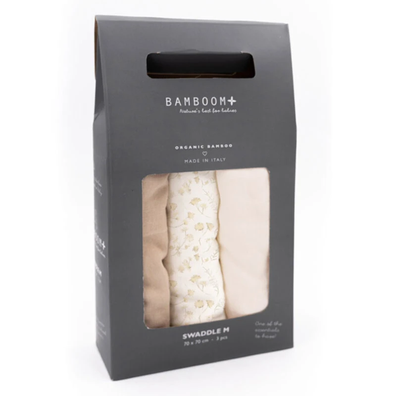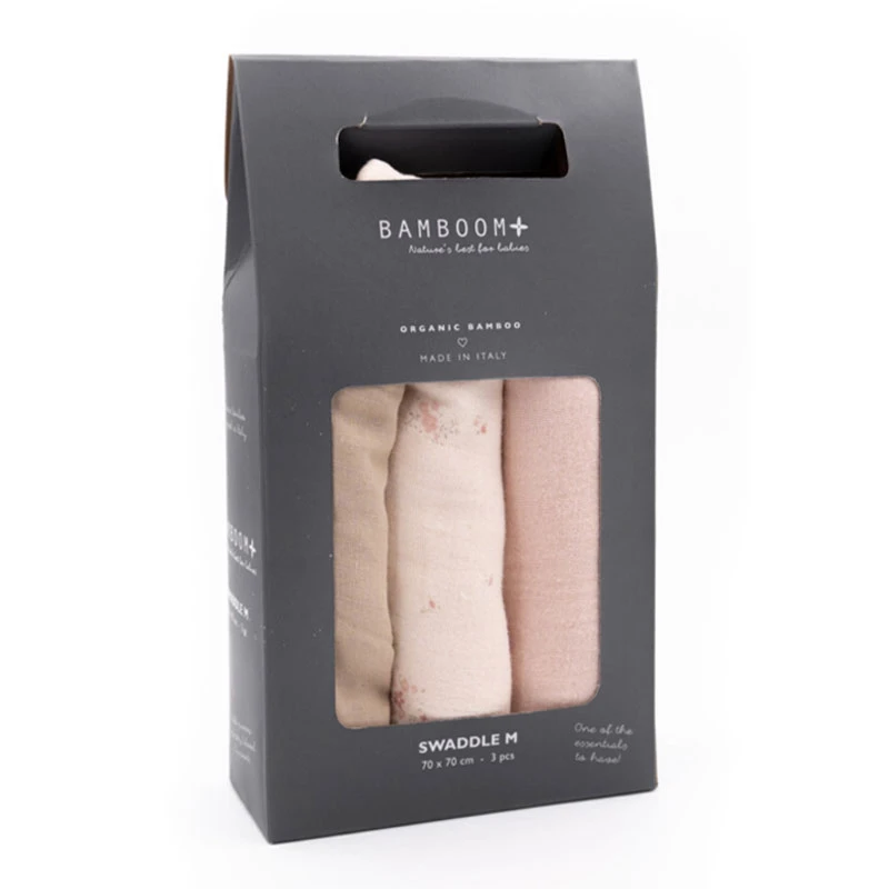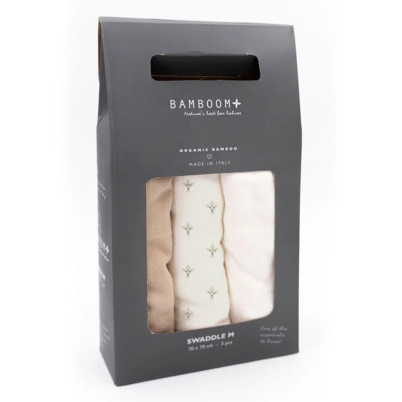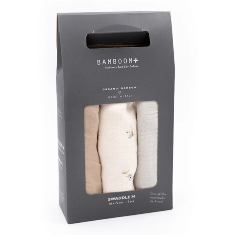 Bamboom 3 Pack Swaddle in bambù organico, 70x70cm è una morbida coperta swaddle multiuso ideale per culla, lettino e carrozzina. Può essere utilizzata come asciugamano, coperta, coprifasciatoio e molto altro ancora. É realizzato in bambù organico, altamente traspirante e dalle proprietà anallergiche, termoregolatrici e assorbe l’umidità. Ogni confezione contiene 3 swaddle in tre varianti colore diverse.