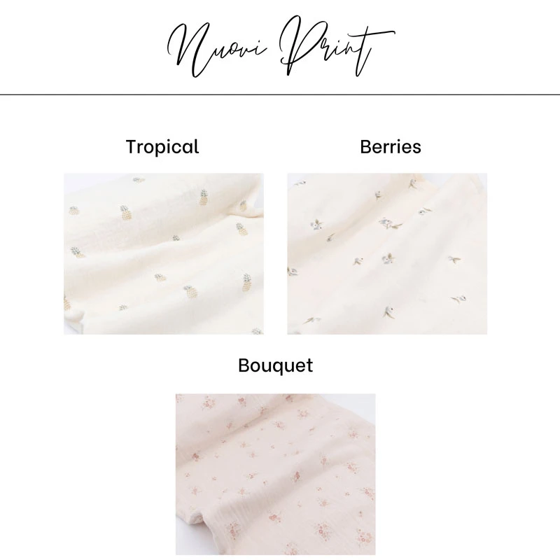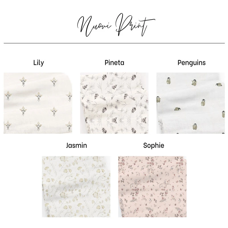 - Disponibile nelle combinazioni: Tropical, Offwhite e Camel – Berries, Light Blue e Camel, Bouquet, Soft Pink e Camel – Sophie, Offwhite e Soft Pink – Lily, Off White e Camel – Jasmine, Yelllow e Camel – Penguins, Off White e Camel – Pineta, Light Blue e Camel