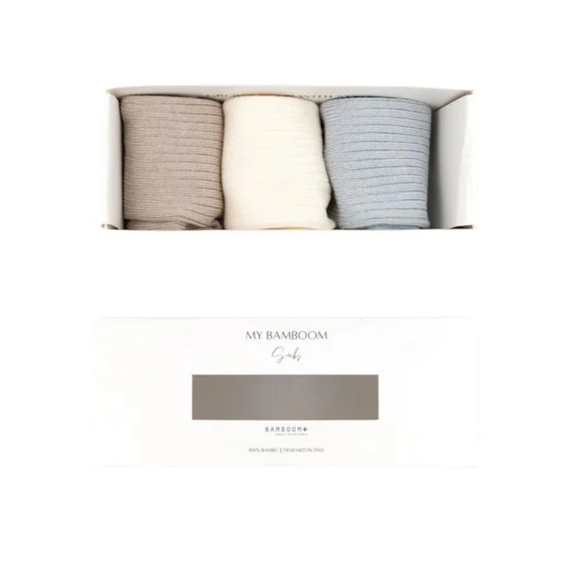 Bamboom Box 3 Paia Calze a Coste in Bambù Organico di Bamboom è una comoda box regalo con all’interno 3 paia di calzini colorati, realizzati in bambù naturale, dalla consistenza morbida. Il Bambù è anche conosciuto per le sue proprietà termoregolatrici e anallergiche. La box contiene 1 paio di calzini a coste color sabbia, 1 paio di calzini a coste color panna e 1 paio di calzini a coste color azzurro. Composizione: 97% Bambù organico – 3% Spandex