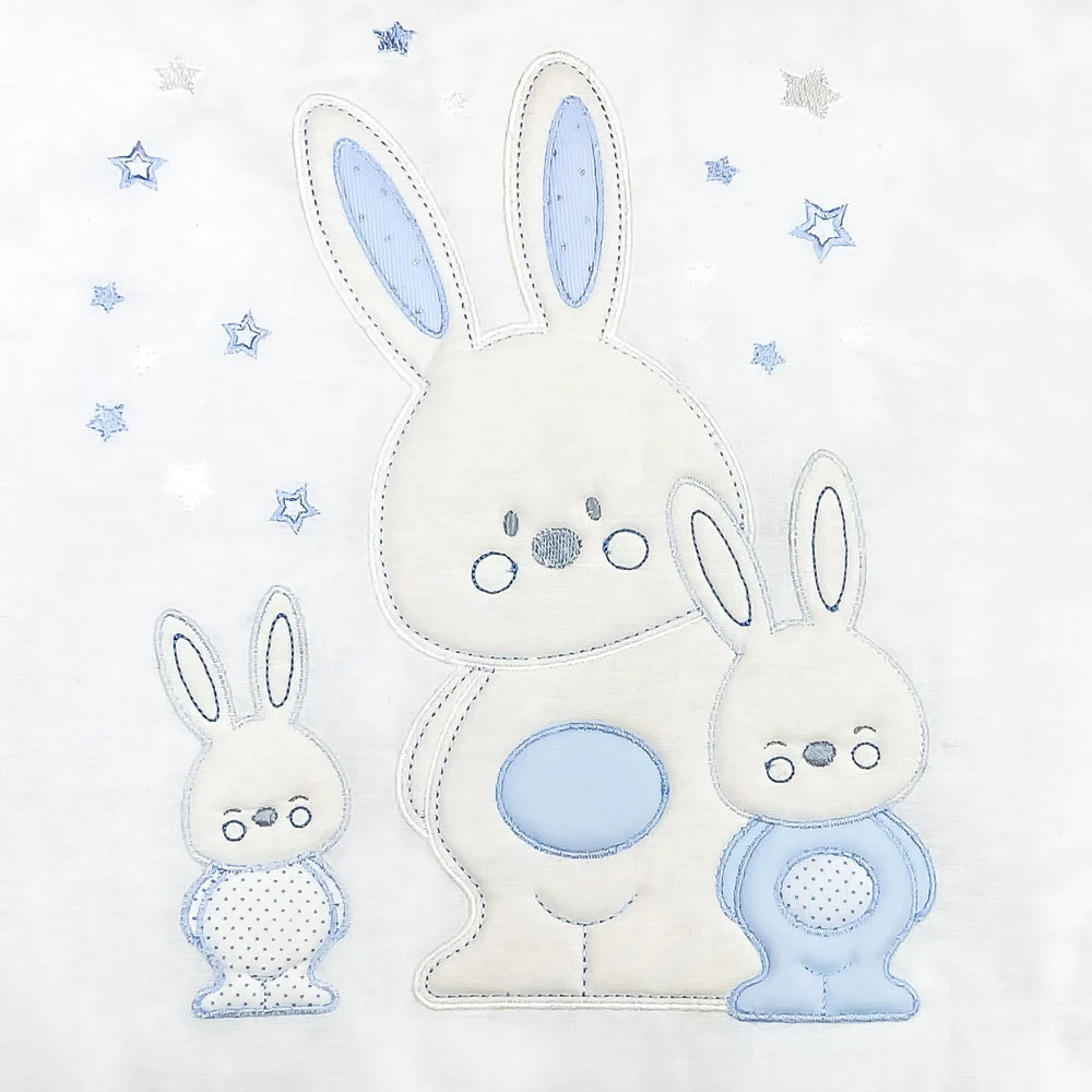 Bebitaly 4pz Set Letto Coniglietti con Piumone Sfoderabile, Paracolpi, Federa di Bebitaly è un morbido set letto composto da piumino (108 x 139 cm – poliestere), paracolpi (55 + 60 + 55 h40 cm – cotone), federa letto (40 x 55 cm – cotone) e copripiumino (112 x 142 cm – cotone). Decorato con 3 simpatici coniglietti!