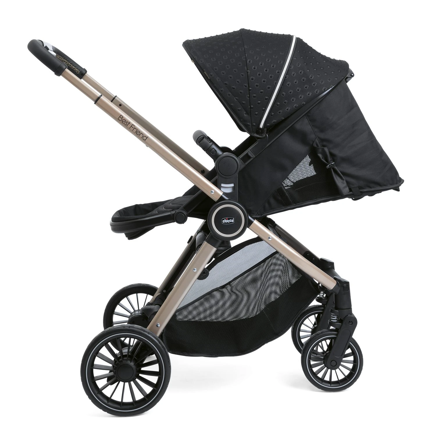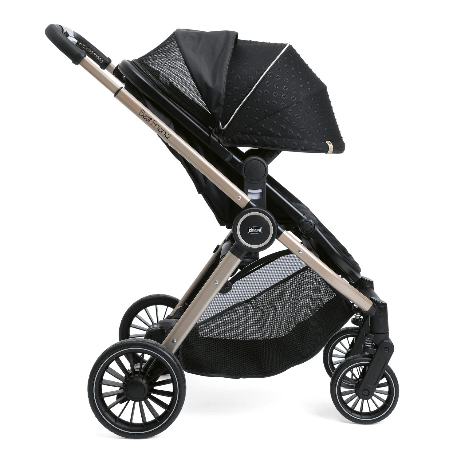 Chicco Passeggino Best Friend Pro può essere utilizzato dalla nascita del tuo bambino fino ai 3 anni. Lo schienale è completamente reclinabile con una sola mano, impugnatura e poggiagambe regolabili. Presenta una cappotta allungata con un segmento nascosto da una zip e una finestra a rete. Ideale per qualsiasi condizioni meteo perché impermeabile all’acqua. Facile da guidare grazie alle ruote dotate di ammortizzatori (su quelle posteriori ci sono anche dei cuscinetti a sfera). Il fascino del passeggino è sicuramente dovuto al telaio metallico colorato e alle finiture raffinate, curate fin nei minimi dettagli. A ciò si aggiungono inserti in eco-pelle e tessuti che conferiscono al Best Friend Pro un look elegante e distintivo.