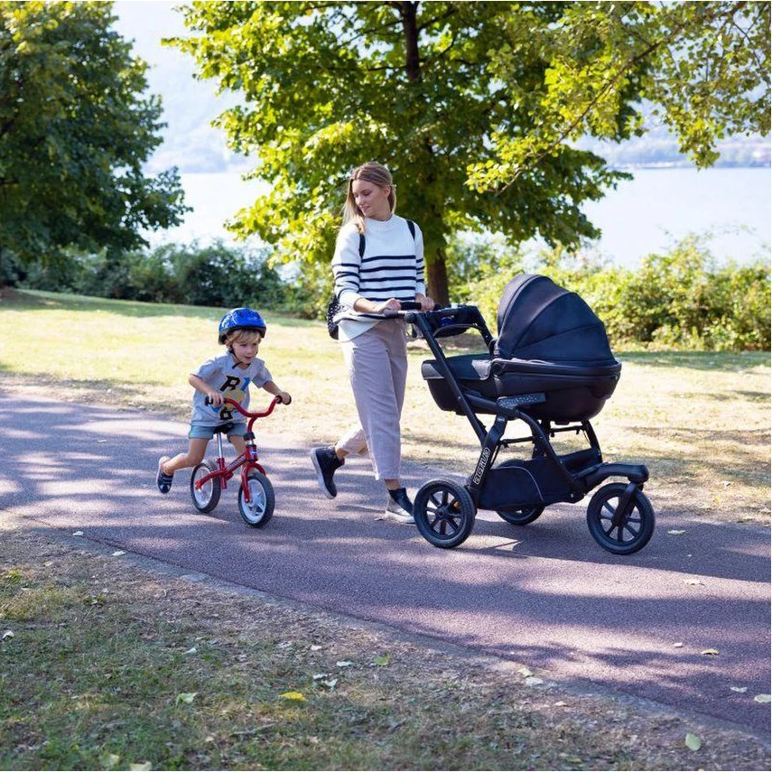 I pratici comandi manuali sull’impugnatura consentono di frenare il passeggino e azionare la ruota piroettante con estrema facilità. Le ruote antiforatura e gli ammortizzatori regolabili in 2 modalità, permettono di adattare il passeggino ad ogni terreno e garantire quindi la massima stabilità e facilità di guida, in ogni situazione.