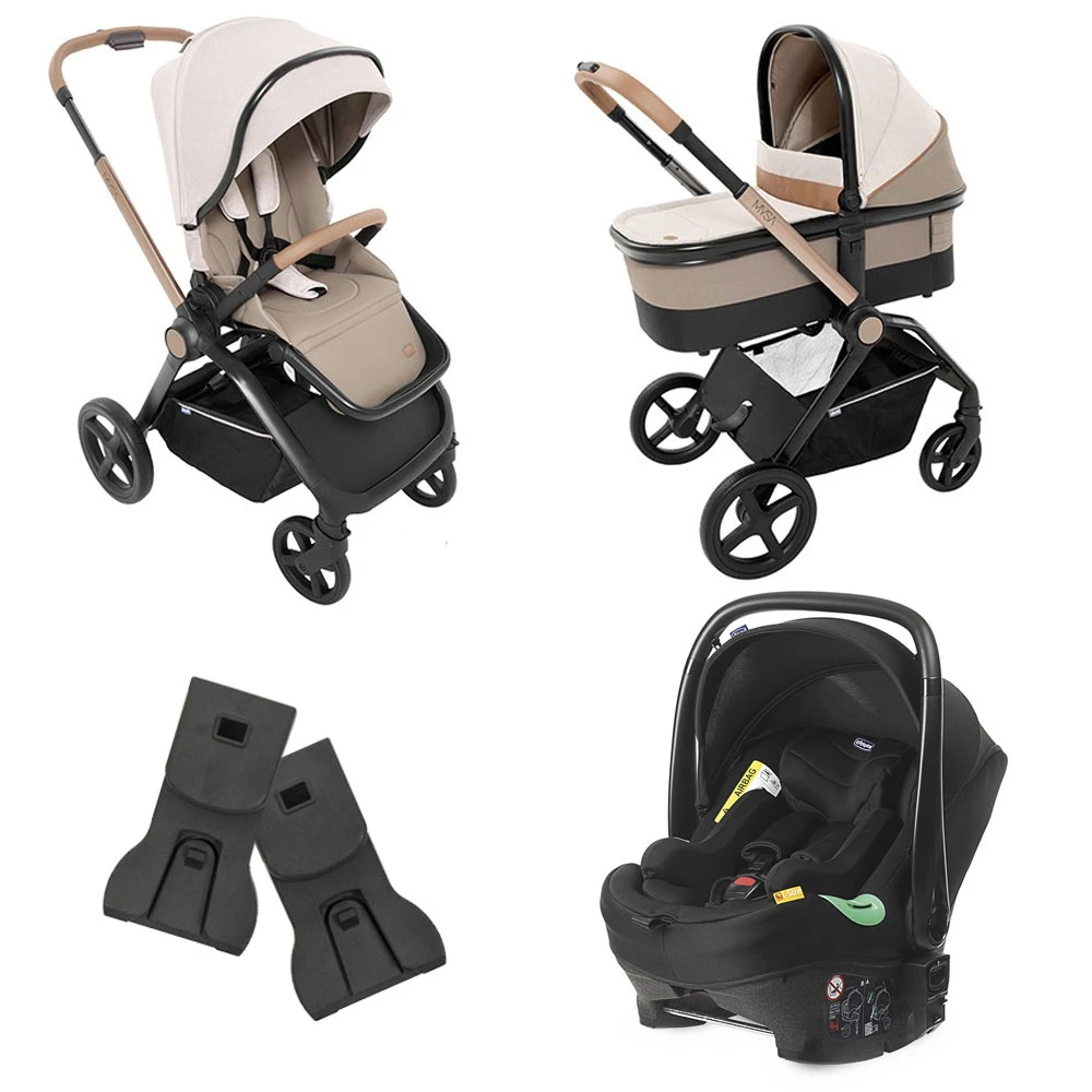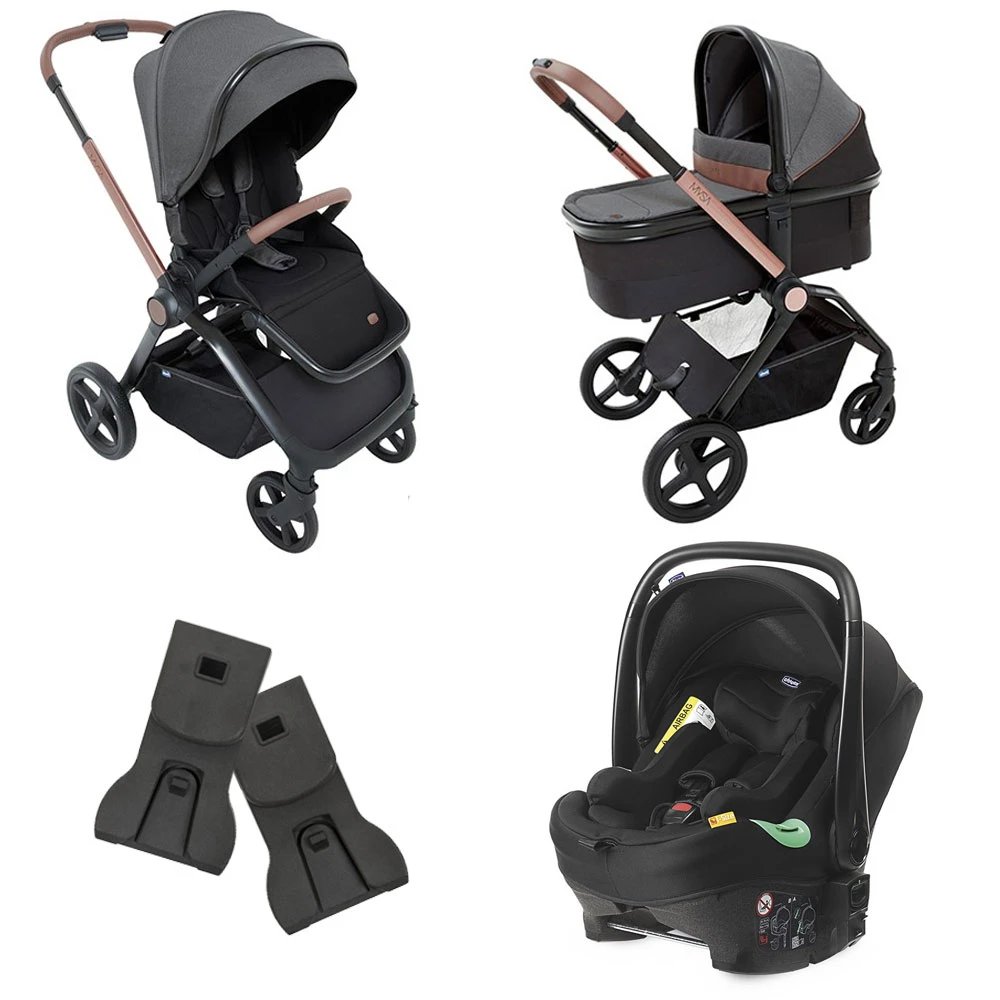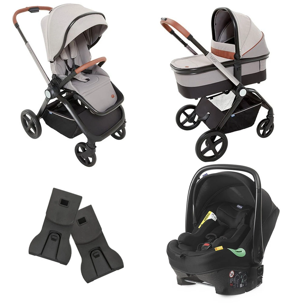 Trio Mysa con Passeggino, Navicella Light e Seggiolino Auto Kiros Evo iSize, Adattatori Ovetto inclusi è un sistema modulare adatto per seguire il tuo bambino dalla nascita fino a 22 Kg. Include Passeggino Mysa con parapioggia, Navicella Chicco Mysa Light, materassino riduttore Cushy Hug e seggiolino auto Chicco Kiros Evo che offre tutta la sicurezza i-Size grazie al sistema di protezione dagli impatti laterali.