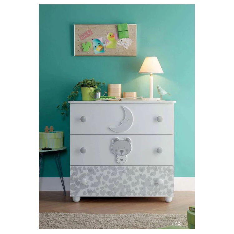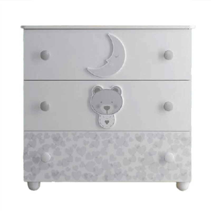 Il Comò Moon è composto da una solida struttura in legno con 3 ampi cassettoni ed ogni cassetto è dotato di due pomoli a forma tonda ed è abbellito con decori in rilievo raffiguranti cuori, orsachiotto e luna, simboli della collezione Moon.