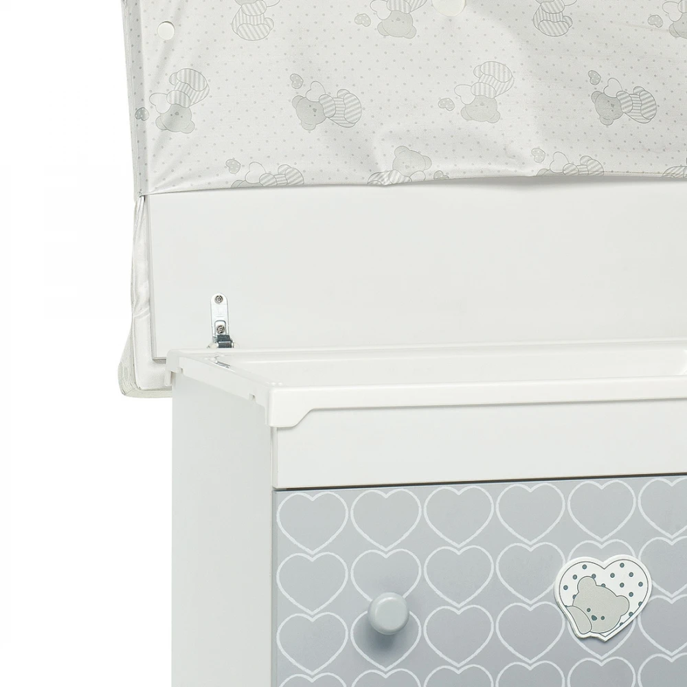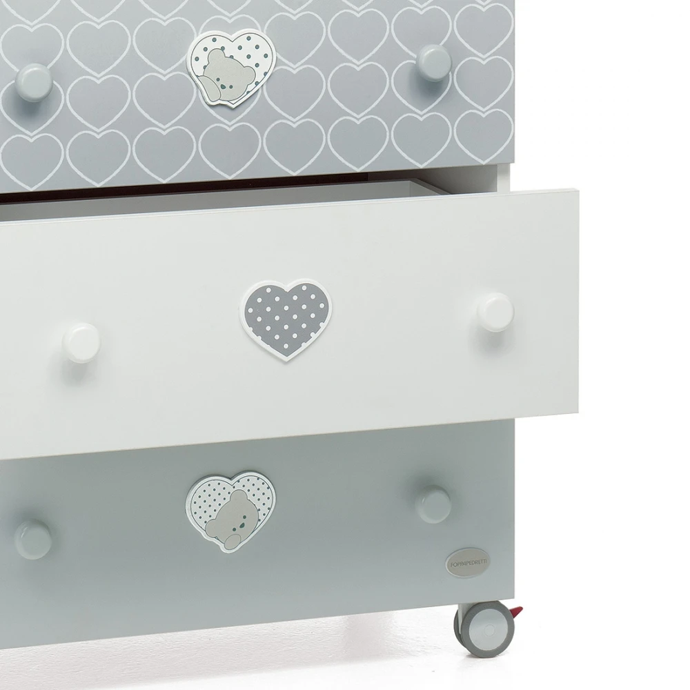 Foppapedretti Bagnetto Fasciatoio Lovely con Cassetti di Foppapedretti è utilizzabile come comoda cassettiera. É dotato di vaschetta per il bagnetto estraibile, con tubo e rubinetto per lo scarico, piano ribaltabile con sistema di sicurezza ammortizzato e pratico materassino. I cassetti di Bagnetto Fasciatoio Lovely Foppapedretti sono decorati con teneri cuori che racchiudono un dolcissimo orsetto. Provvisto di ruote gommate antigraffio con sistema frenante, per agevolare ogli spostamento. Struttura in legno 100% made in Italy.