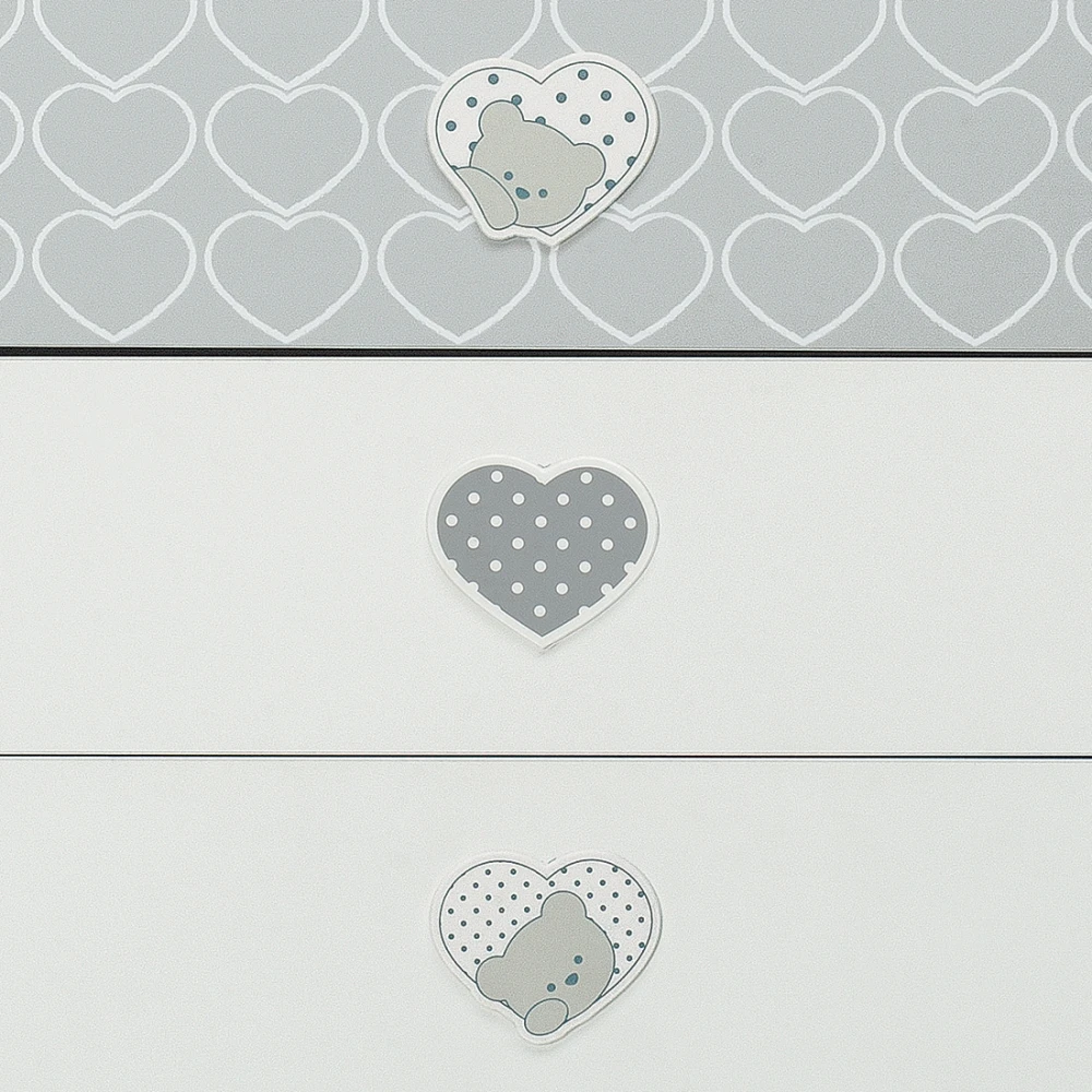 Foppapedretti Cassettiera Lovely con Cassettoni e Piano d’appoggio di Foppapedretti ha 4 ampi cassetti, tre dei quali decorati con graziosi cuori che racchiudono un dolce orsetto. Offre un ampio piano superiore, dove si può collocare il materassino imbottito per essere utilizzata come pratico fasciatoio. La struttura solida e durevole nel tempo è 100% Made in Italy!