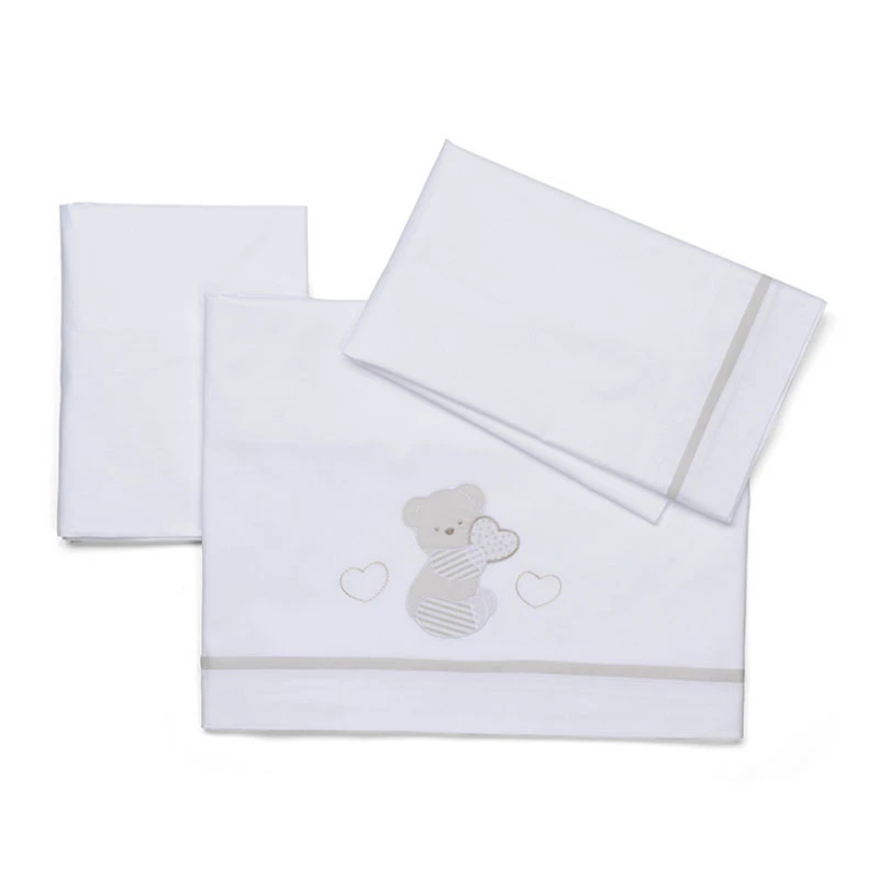 Foppapedretti Completo Lenzuola, Coprimaterasso e Federa per Lettino Dolcecuore di Foppapedretti è caratterizzato da eleganti ricami che richiamano l’orsetto e i cuori della cameretta. Il set è composto da lenzuolino sopra ricamato, lenzuolo sotto angolato e federa per cuscino.