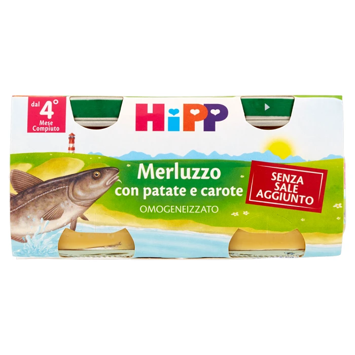 Hipp Merluzzo con Carote e Patate Omogeneizzato. Indicato dal 4° mese compiuto, secondo il parere del pediatra.