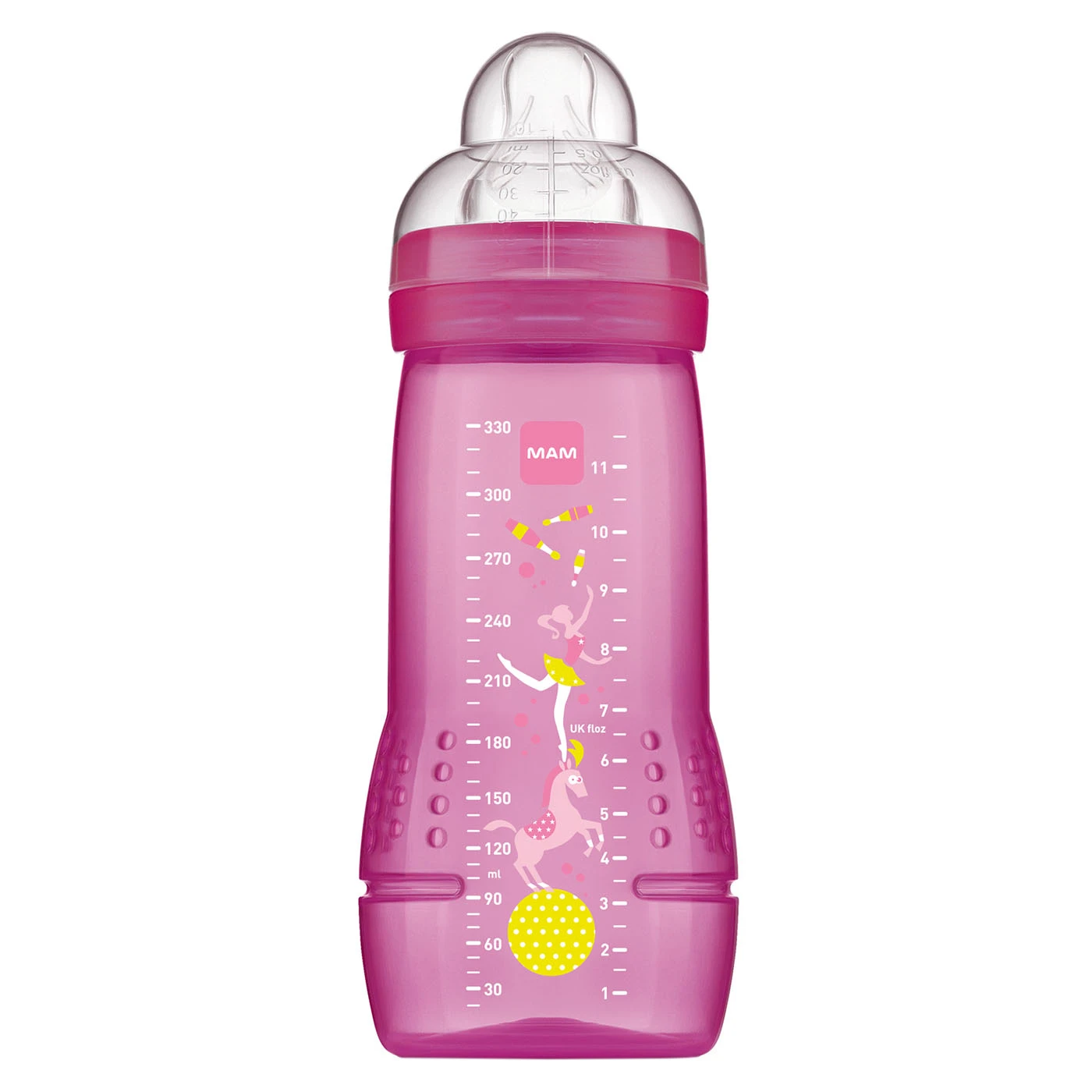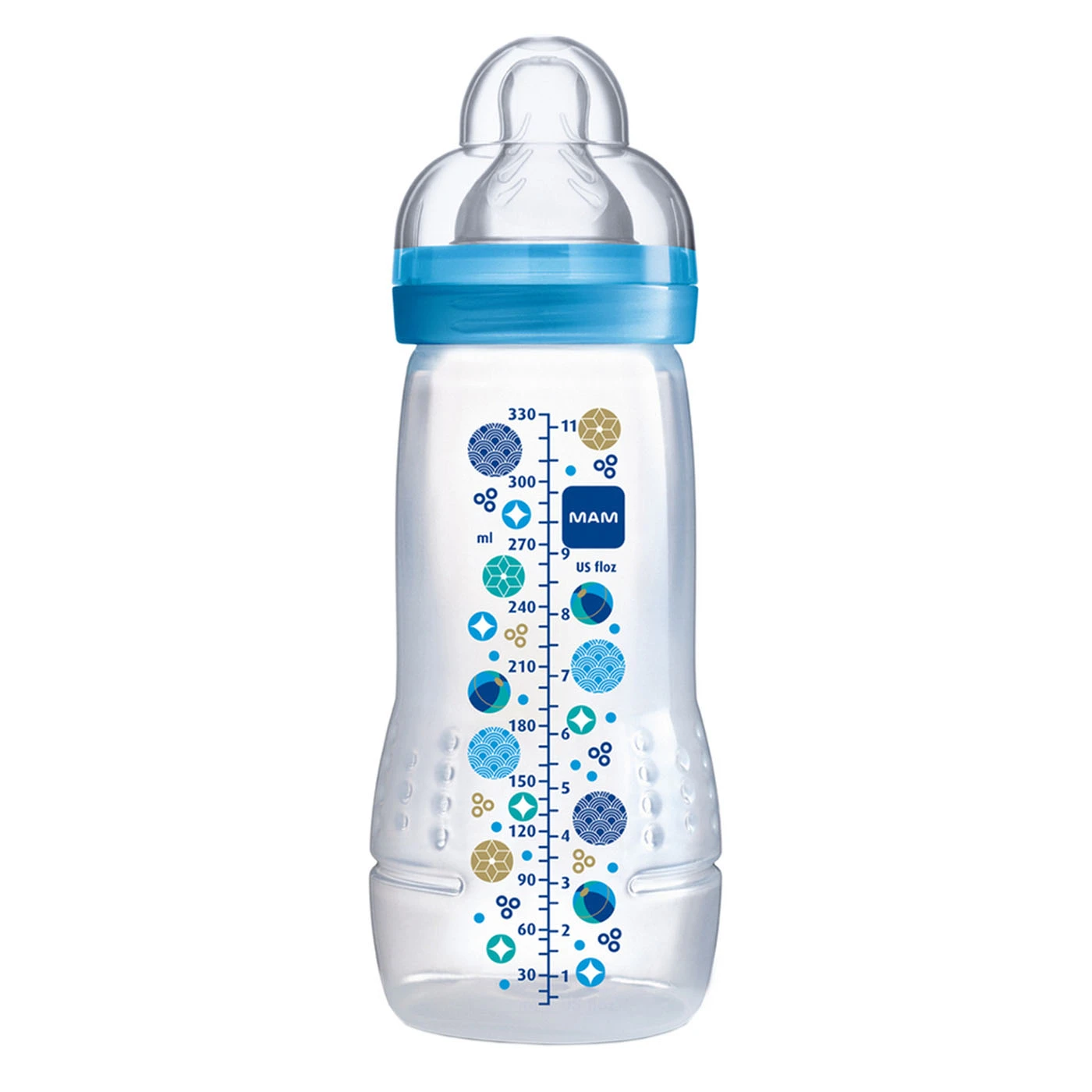 Mam Biberon First Bottle con Tettarella in Silicone 330ml di Mam è perfetto come biberon per i primi mesi. É dotato di tettarella in silicone inodore trasparente e tappo di sicurezza. Privo di BFA.