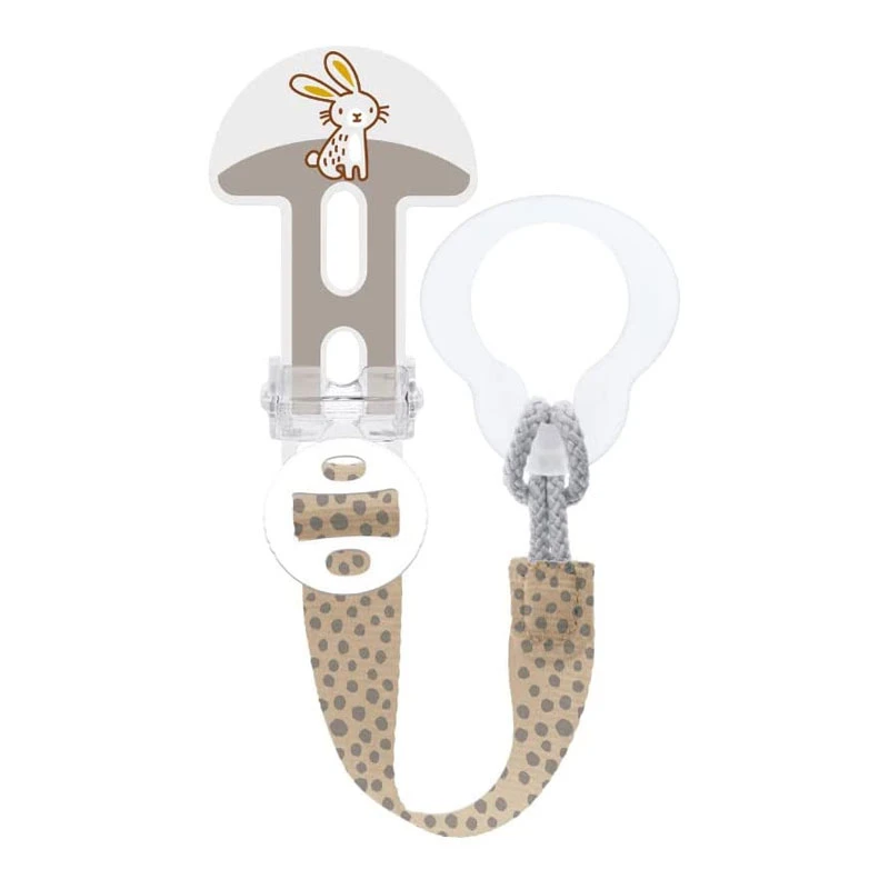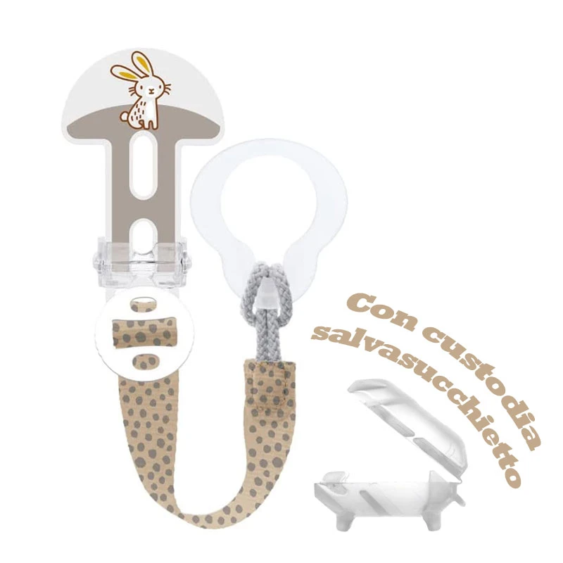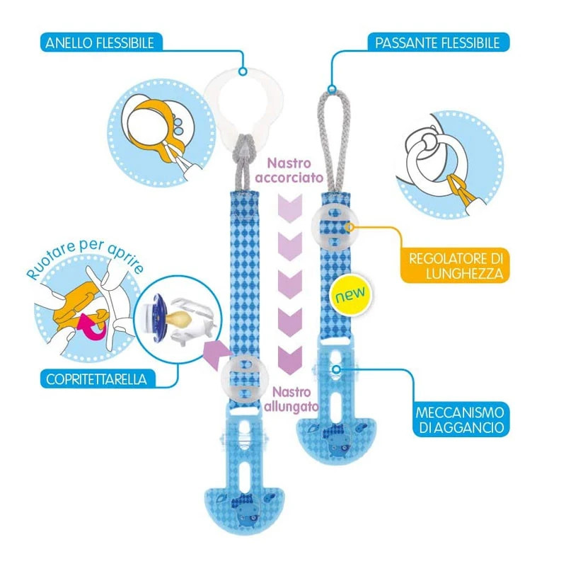 - Dotato di anello flessibile che si allaccia ai bottoni dei succhiotti con facilità