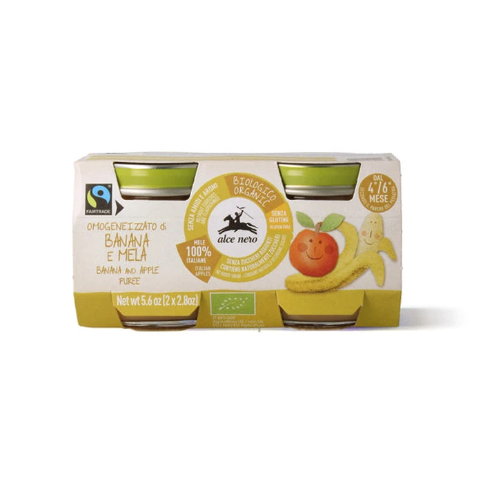 L’Omogeneizzato di Banana e Mela bio di Alce Nero è prodotto con banane Fairtrade e mele biologiche italiane. La ricetta dell’omogeneizzato è studiata per lasciare inalterato il gusto della frutta fresca e permette di nutrire i bambini senza l’utilizzo di dolcificanti, aromi, amidi, coloranti e conservanti.