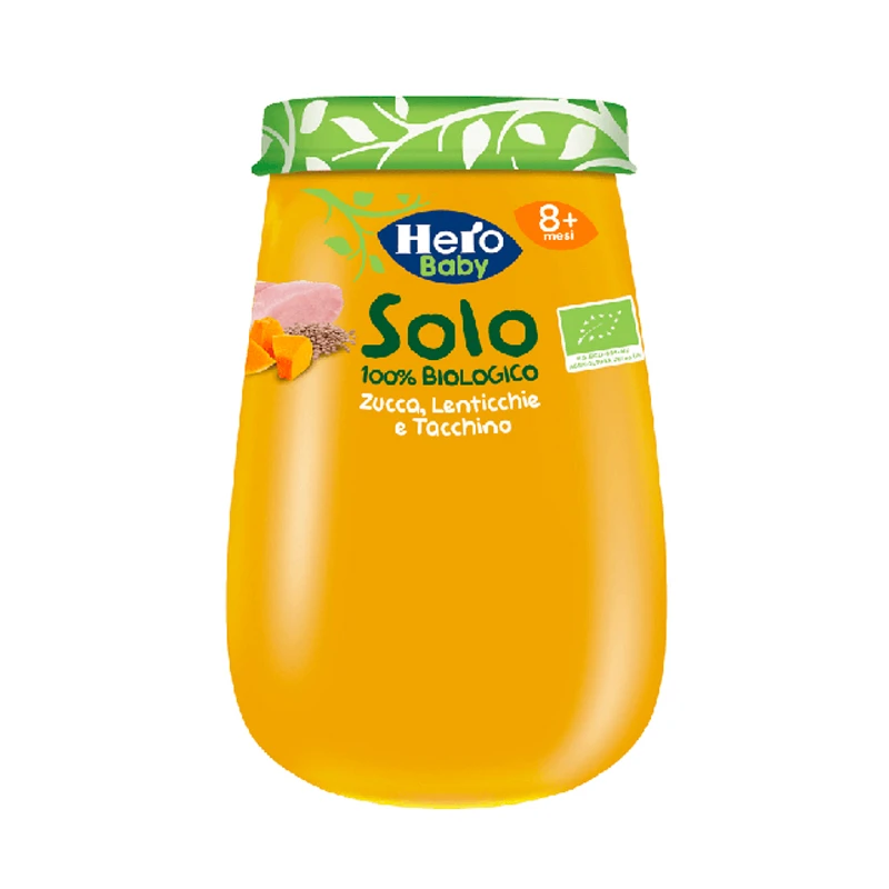 Hero Baby Solo Omogeneizzato Zucca, Lenticchie e Tacchino è una ricetta semplice preparata con ingredienti attentamente selezionati, nata per accompagnare i più piccoli alla scoperta graduale di nuovi sapori assecondando il naturale sviluppo della loro prima infanzia. A partire dagli 8 mesi, salvo diverso parere del pediatra.
