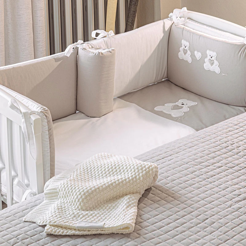 Set 4pz Rivestimento Tessile Piumino, Coprimaterasso, Federa, 2 Paracolpi per Lettino Lella – Orso di Picci è realizzato in 100% cotone certificato con OEKO-TEX ed è ricamato da graziosi orsetti che doneranno un aspetto ancora più accogliente al primo lettino del tuo bambino. Include: