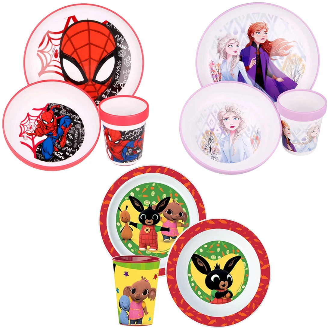 Set Pappa 3pz con Ciotola, Piatto Piano e Bicchiere, fantasia Bing, Spiderman, Frozen di BabyCare è un comodo set pappa confezionato come un cofanetto regalo! Contiene: