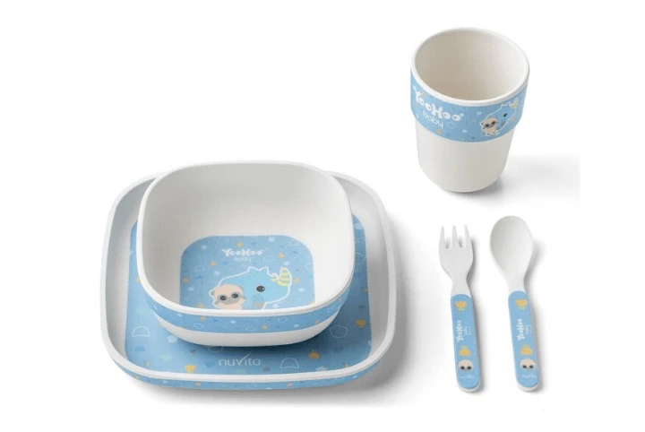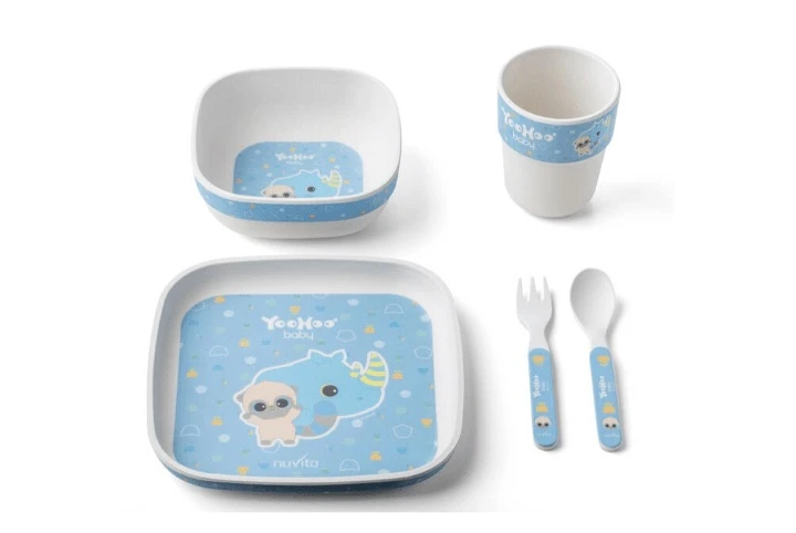 Il Set Pappa in Bamboo di Nuvita è composto da 5 pezzi, che includono un piattino, una ciotola, un bicchiere, un cucchiaio e una forchetta.