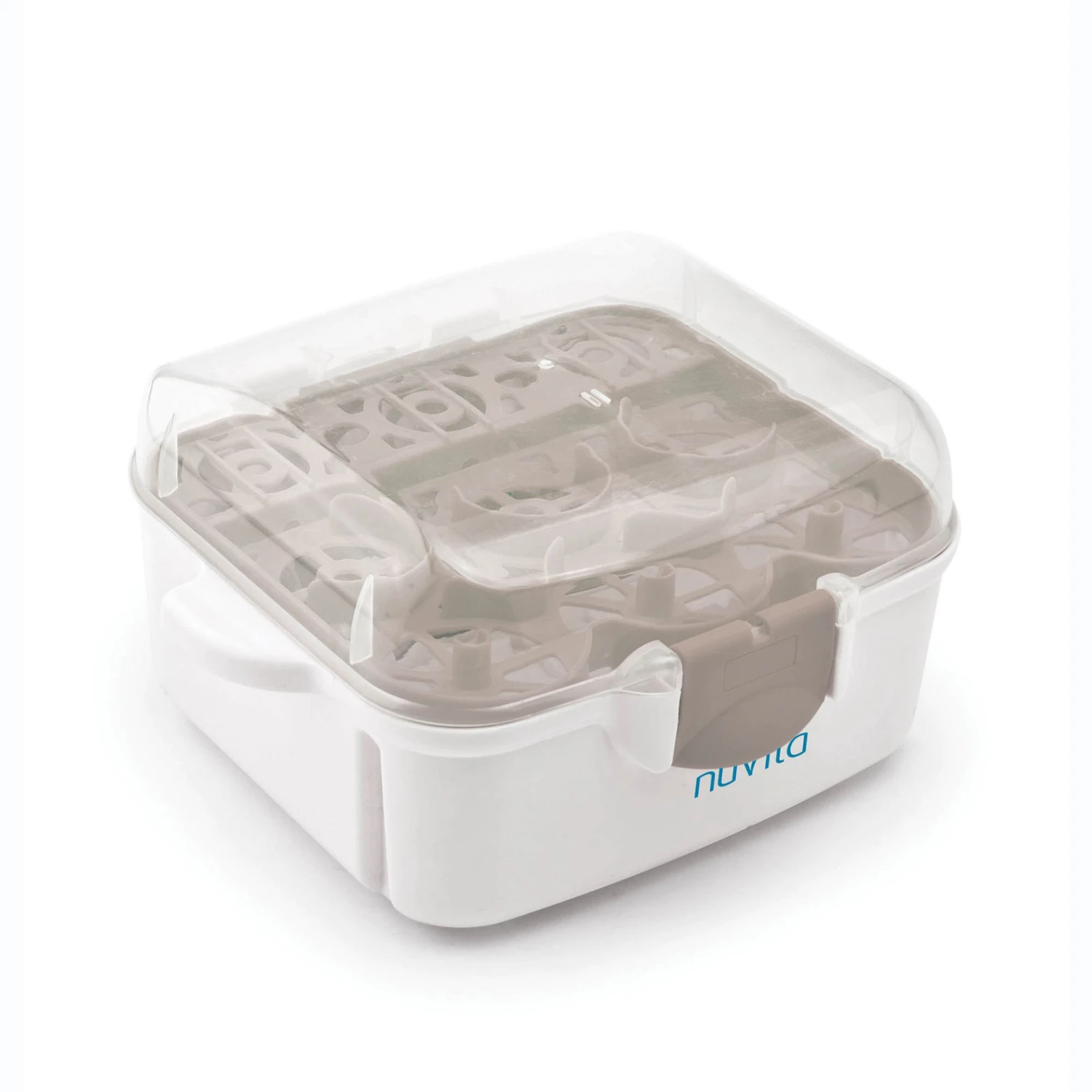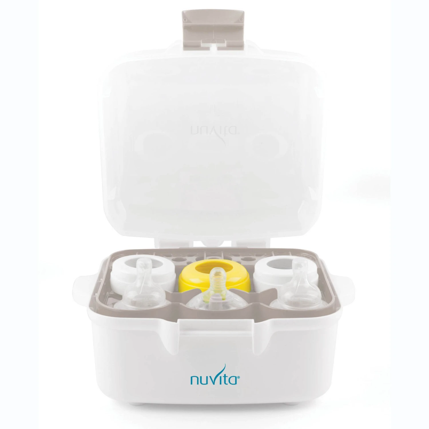 Lo Sterilizzatore per Forno a Microonde di Nuvita per forni a microonde è compatto, leggero e adatto sia in casa che in viaggio. Ha manici e chiusura a clip laterali per una maggior sicurezza durante l’uso e, dopo averlo estratto dal forno, se il coperchio dello Sterilizzatore non viene sollevato, il contenuto rimane sterile per 24 ore. Si inserisce nei forni a microonde con potenza da 800 a 1100 Watt e ha un tempo di sterilizzazione di 4 minuti, mentre per i forno a microonde con più di 1850 Watt di potenza il tempo di sterilizzazione è di soli 2 minuti. Lo Sterilizzatore della Nuvita è adatto anche per forni a microonde di piccole dimensioni e può contenere fino a 3 biberon a collo largo. Con lo Sterilizzatore per forni a microonde si eliminano i germi e i batteri in maniera naturale senza residui chimici, odori o sapori.