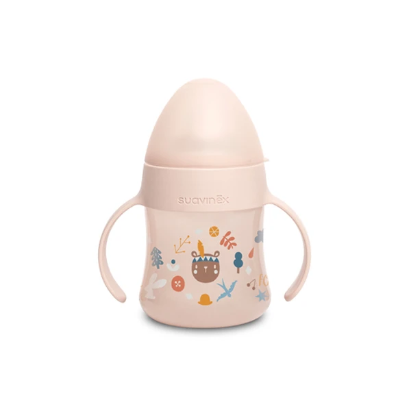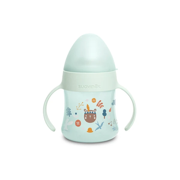 Il Biberon First Into the Forest +4m 150ml di Suavinex, con disegno ergonomico, è pensato per le manine del bambino e consente una facile impugnatura rendendolo maneggevole per imparare a bere da soli ed agevolare il passaggio dalla tettarella alla prima tazza.
