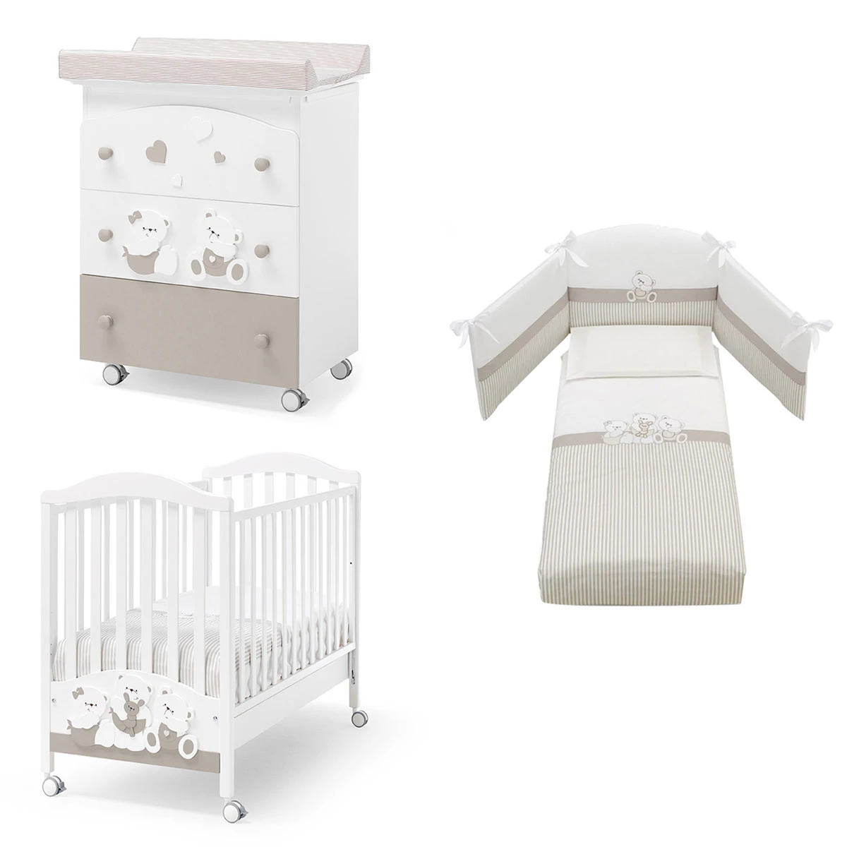 Tris B Letto + Bagnetto + Completo Piumone Mirtillo di Erbesi propone tutto il necessario per arredare con stile e praticità la prima cameretta del tuo bambino! É un set composto da Lettino Mirtillo, Bagnetto/Fasciatoio Mirtillo e Completo Piumone Mirtillo, è ideale per accogliere il tuo bambino dalla nascita fino ai primi anni di vita. Disponibile nel colore Bianco/Tortora.