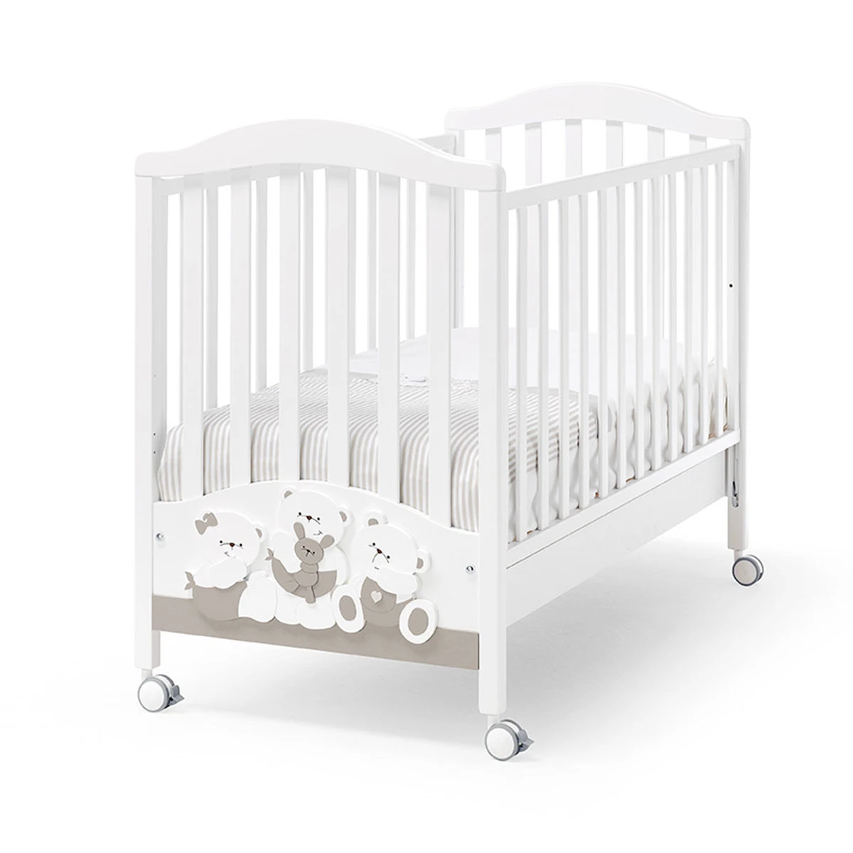 Il Lettino Mirtillo ha una robusta struttura in legno di faggio massello. Le sponde movibili sono provviste di sistema di movimento Secur-Baby azionabile in due passaggi. Le ampie ruote piroettanti, di cui 2 con freni, sono realizzate in gomma antitraccia. Con il lettino Mirtillo è incluso il Kit alzata rete. Il materasso non è incluso.