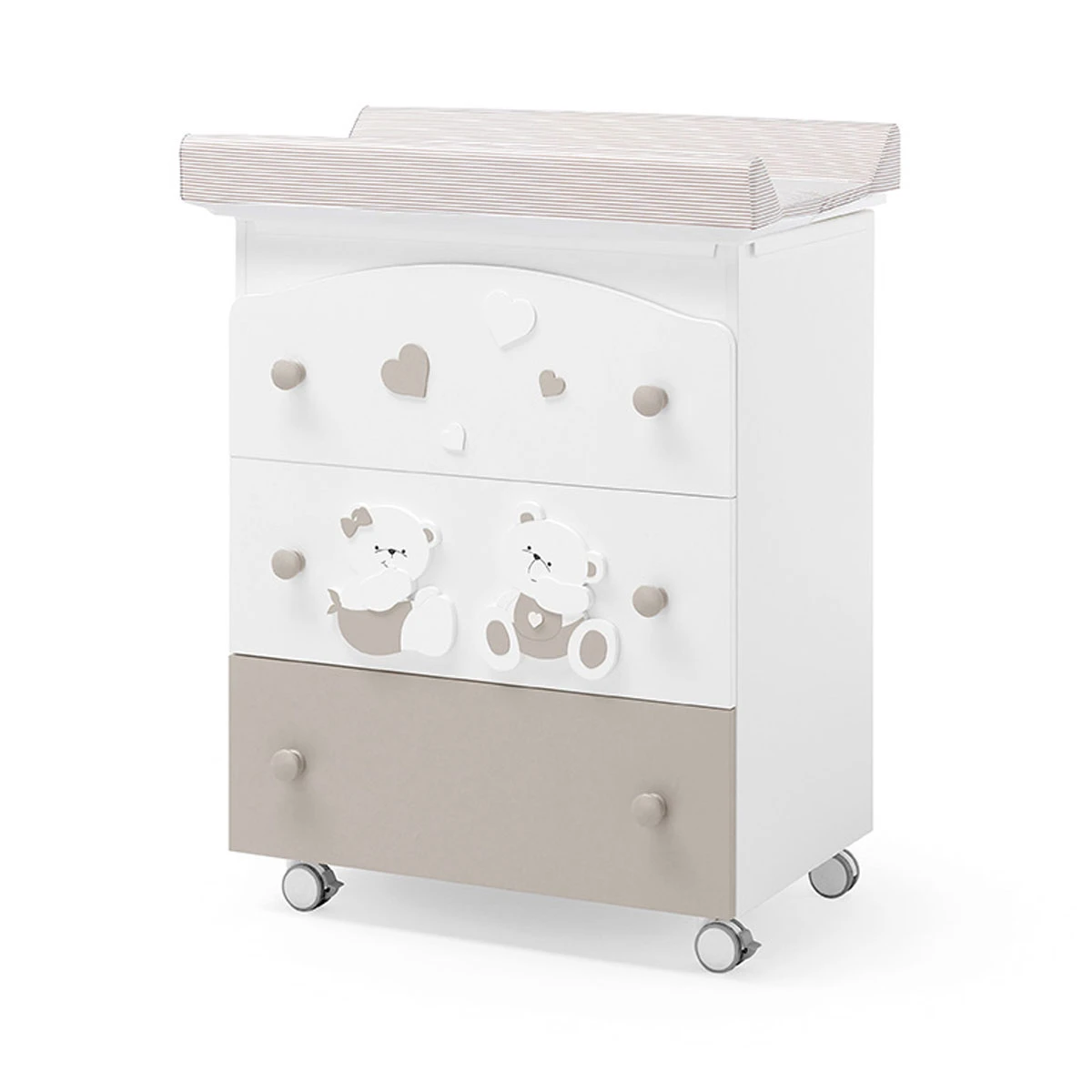 Il Bagnetto è una pratica cassettiera realizzata in truciolare certificato E1 a bassa emissione di formaldeide rivestito in PVC. É una soluzione pratica è versatile perché da fasciatoio per il cambio pannolino si trasforma in vaschetta per il bagnetto. É provvisto di cerniere per il top anticaduta, schienale in pannello, maniglie in legno e 4 ruote con gomma antitraccia di cui due dotate di sistema frenante.
