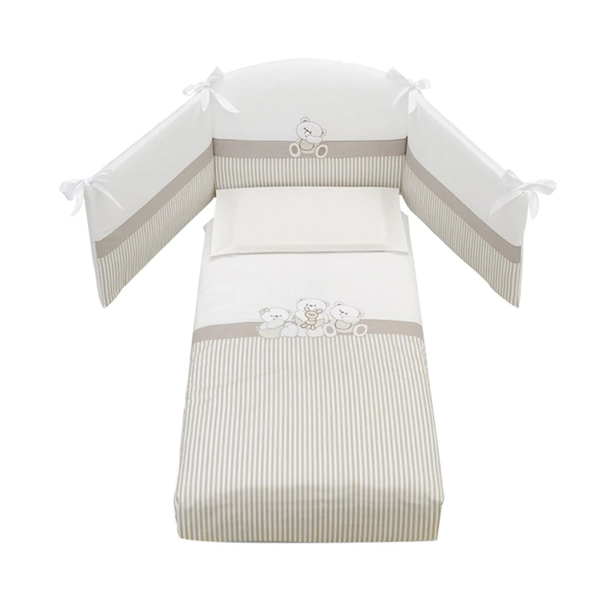 Il Completo Piumone è perfetto da abbinare al lettino Mirtillo di Erbesi. Consiste in un pratico corredo tessile composto da Trapunta con imbottitura sfilabile, Paracolpi e Federa cuscino, tutti i tessuti sono Made in Italy, realizzati in 100% cotone e abbelliti con graziosi ricami di orsetti.